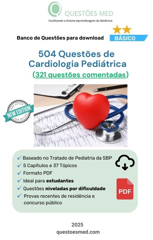 Banco de Questões MED Básico de Cardiologia Pediátrica no formato PDF, organizado segundo o Tratado de Pediatria da SBP, contendo 504 questões sendo 321 comentadas e agrupadas em 5 capítulos e 37 tópicos.