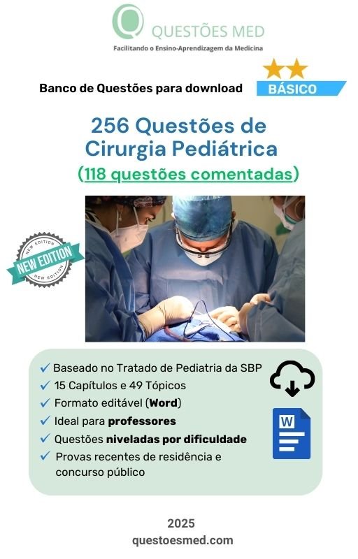 - Banco de Questões MED sobre Cirurgia Pediátrica no formato Word, organizado segundo o Tratado de Pediatria da SBP (2022), contendo 256 questões sendo 118 comentadas.