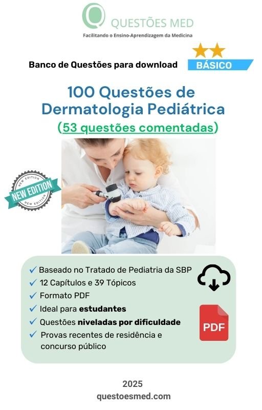 Banco de Questões MED Básico sobre Dermatologia Pediátrica no formato PDF , organizado segundo o Tratado de Pediatria da SBP, com 100 questões sendo 53 comentadas por especialistas.