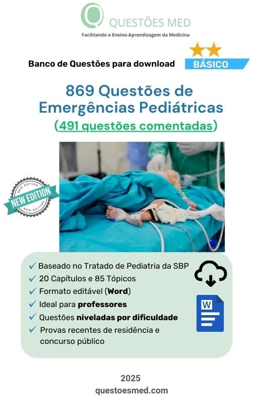 Banco de Questões MED Básico de Emergências Pediátricas no formato Word, organizado segundo o Tratado de Pediatria da SBP, contendo 869 questões sendo 491 comentadas.