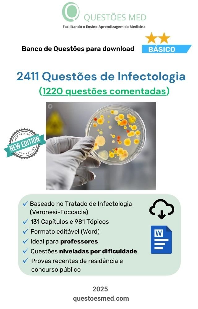 Banco de Questões MED Básico sobre Infectologia no formato Word, organizado segundo o Tratado de Infectologia de Veronesi-Foccacia (2015), com 2411 questões sendo 1220 comentadas, distribuídas em 131 capítulos e 981 tópicos. Questões de provas de residência e concurso público.