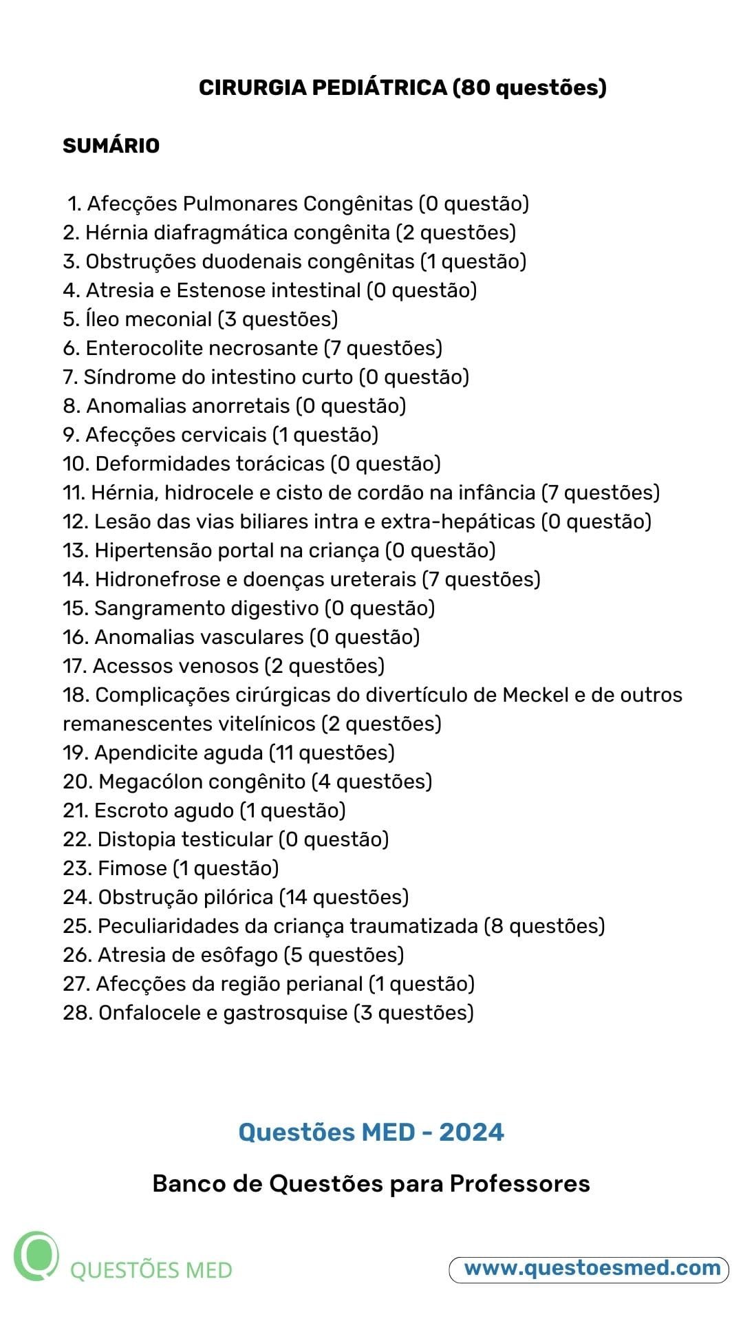 - Banco de Questões MED gratuito contendo 80 Questões sobre Cirurgia Pediátrica no formato Word, organizado segundo o Tratado de Pediatria da SBP (2022).
