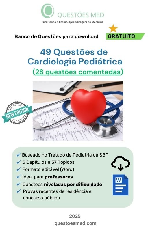 - Banco de Questões MED Gratuito de Cardiologia Pediátrica no formato Word, organizado segundo o Tratado de Pediatria da SBP (2022), contendo 49 questões, sendo 28 comentadas.