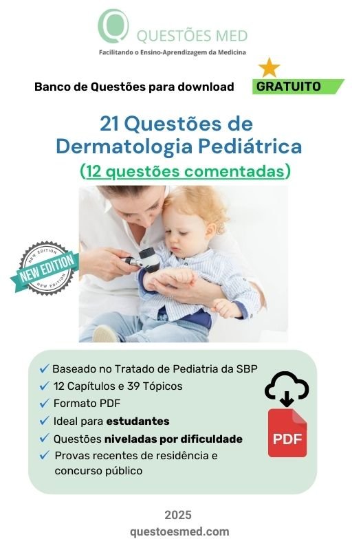 Banco de Questões MED Gratuito sobre Dermatologia Pediátrica no formato PDF, organizado segundo o Tratado de Pediatria da SBP, com 21 questões sendo 12 comentadas por especialistas.