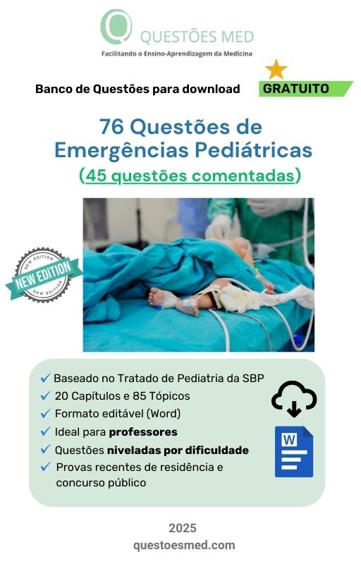 Banco de Questões MED 📚 Gratuito de Emergências Pediátricas no formato Word, organizado segundo o Tratado de Pediatria da SBP, contendo 76 questões sendo 45 comentadas 💬.
