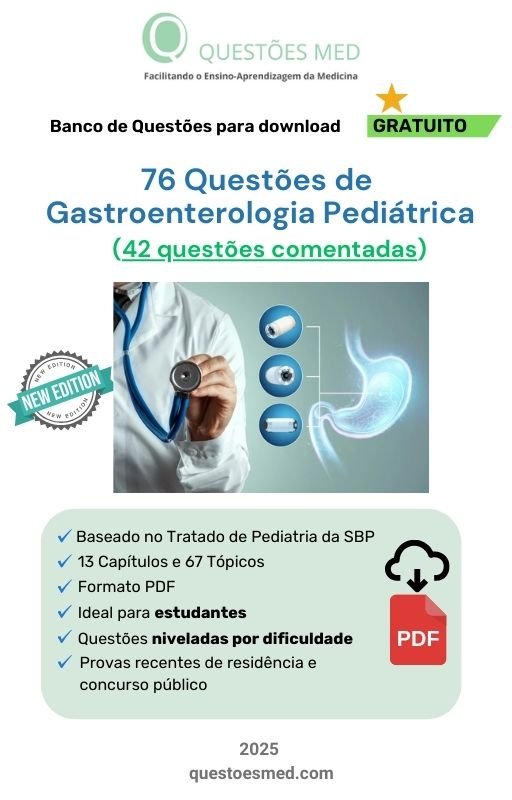 Banco de Questões MED Gratuito de Gastroenterologia Pediátrica no formato PDF, organizado segundo o Tratado de Pediatria da SBP, contendo 76 questões sendo 42 comentadas.