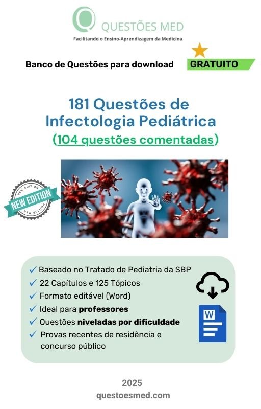 Banco de Questões MED Gratuito sobre Infectologia Pediátrica no formato Word, organizado segundo o Tratado de Pediatria da SBP, com 181 questões sendo 104 comentadas.