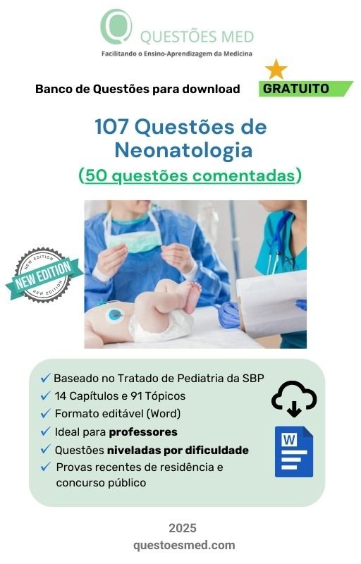 Banco de Questões MED Gratuito de Neonatologia no formato Word, organizado segundo o Tratado de Pediatria da SBP, contendo 107 questões sendo 50 comentadas.