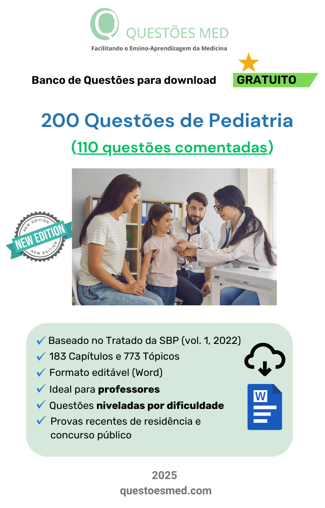 Banco de Questões MED Gratuito de Pediatria Geral, baseado no vol. 1 do Tratado da SBP de 2022. Um produto único no mercado e de alto valor pedagógico. Conheça também as versões Básica e Premim contendo milhares de questões.