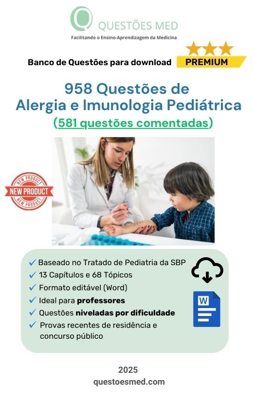 - Banco de Questões Premium contendo 958 Questões sobre Alergia e Imunologia Pediátrica no formato Word, organizadas segundo o Tratado de Pediatria da SBP (2022), sendo 581 questões com comentários detalhados das respostas.