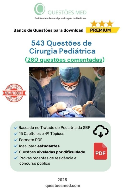 - Banco de Questões MED sobre Cirurgia Pediátrica no formato PDF, organizado segundo o Tratado de Pediatria da SBP (2022), contendo 543 questões sendo 260 comentadas.