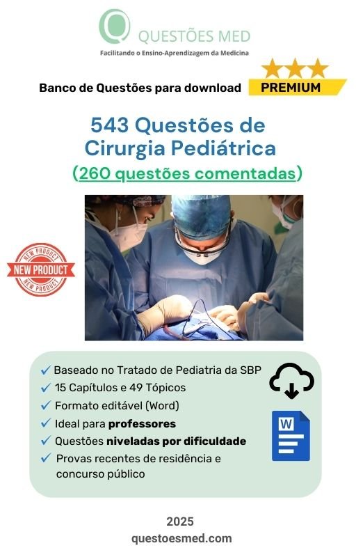 - Banco de Questões MED sobre Cirurgia Pediátrica no formato Word, organizado segundo o Tratado de Pediatria da SBP (2022), contendo 543 questões sendo 260 comentadas.