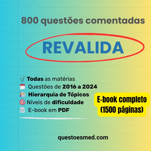 E-book com 800 questões comentadas do REVALIDA (2016–2024), organizadas por tema e dificuldade, com comentários detalhados e mais de 1500 páginas.