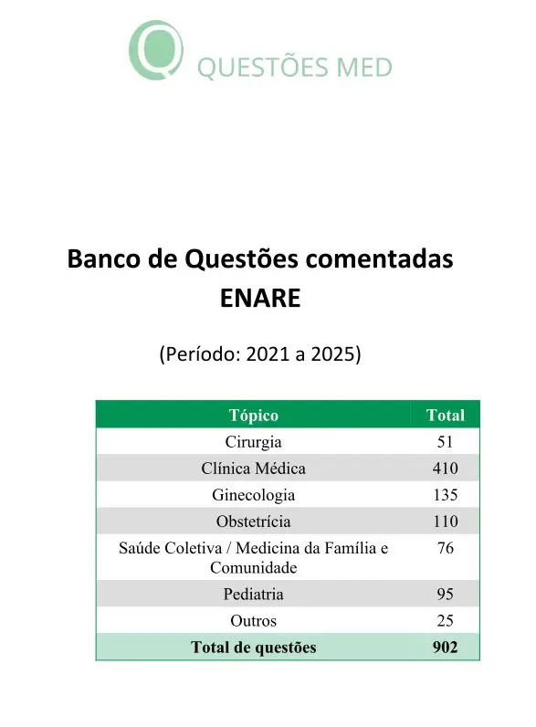 Este E-book exclusivo do Questões MED reúne 900 questões comentadas do ENARE (2021–2025), cuidadosamente classificadas por nível de dificuldade (fácil, médio e difícil) e por tópicos em quatro níveis hierárquicos, permitindo um estudo realmente extensivo e direcionado.